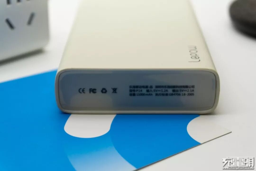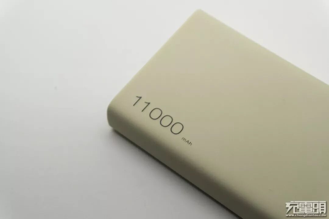 移动电源背面非常简单,上方仅有容量11000mAh标识,大面积留白给人以清爽简洁的印象。