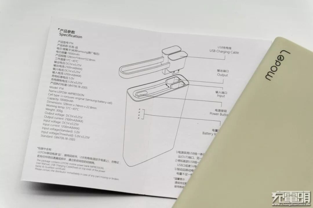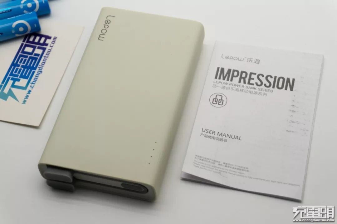 先熟悉一下产品说明书,乐泡移动电源的最大特点是自带数据线,从产品宣染图上可以看出,短的数据线可以分离,不用的时候就固定在移动电源本体上,看来实用性能还是非常不错的。