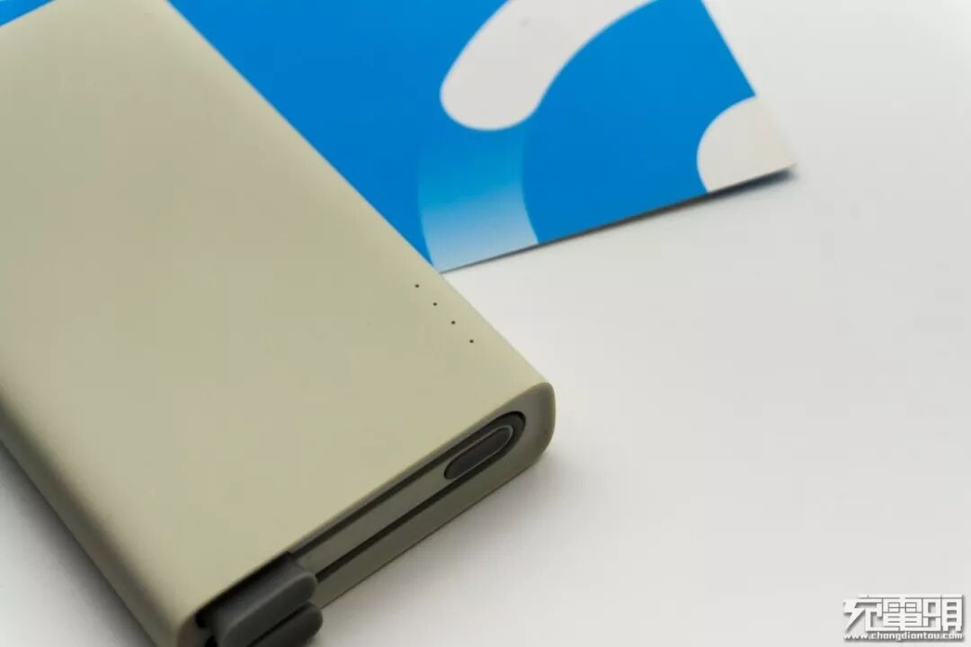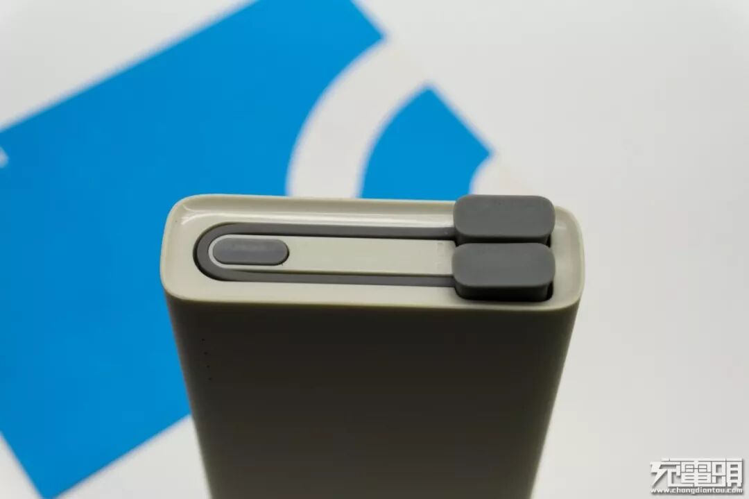 输出面板,左边是长形的电源开关,右边环绕的是自带数据线,米灰搭配的设计风格还是非常好看的。