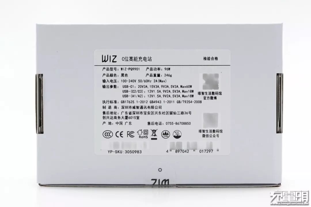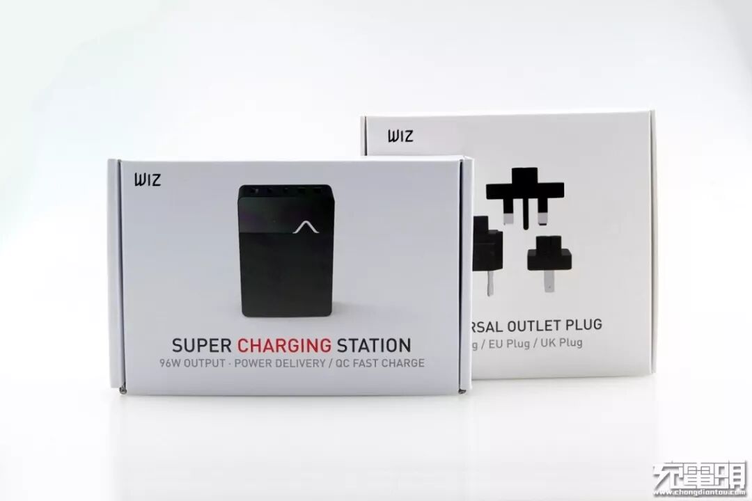 这一次小编拿到的是两个外包装盒,不过只是一个产品,另外一个是配件的单独包装,并且从示意图上面就可以看得出来产品是标配不止一款插头的。左上角带有“WIZ”的Logo标识,中间为产品的外形图片,并且下面带有“SUPER CHARGING STATION”的字样,意为超级充电系统,小字部分为产品的性能说明,这个我们稍后再看。