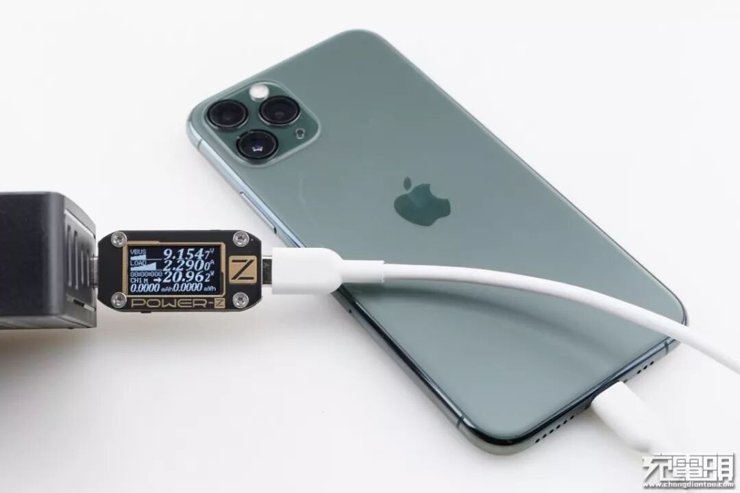 iPhone11 Pro 支持USB PD和Apple2.4A快速充电协议,使用USB-C1为iPhone11 Pro充电,功率为9.15V 2.29A 20.96W,成功握手USB PD快充协议。