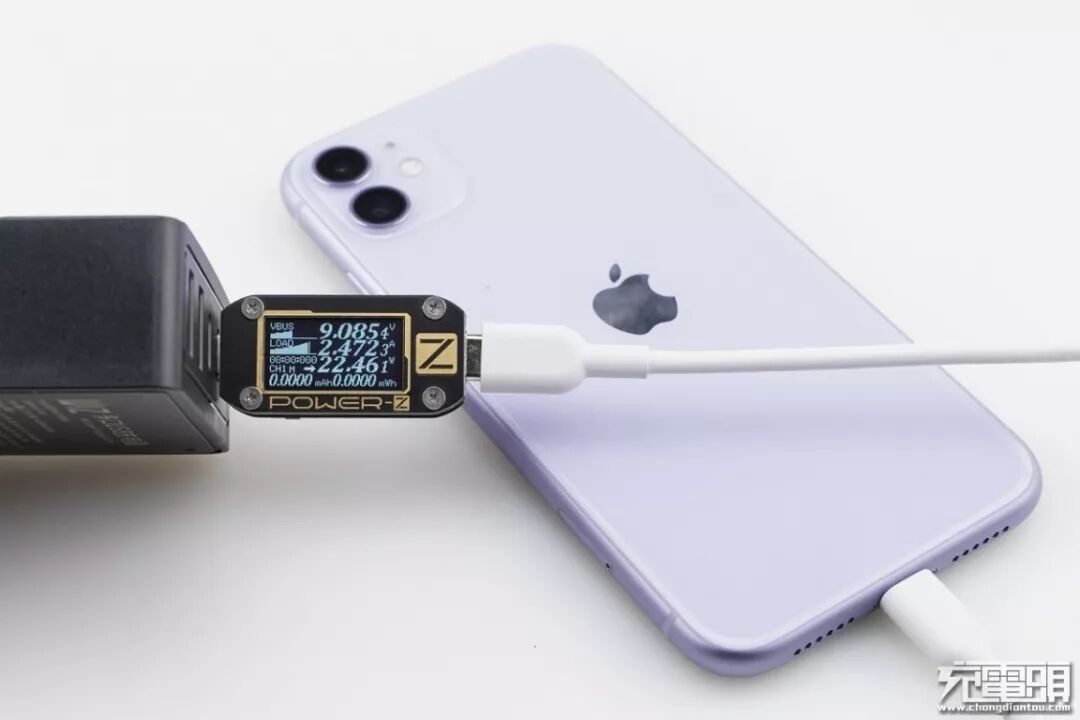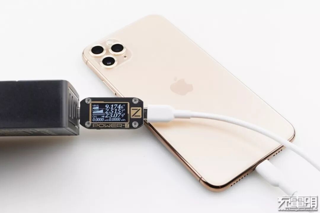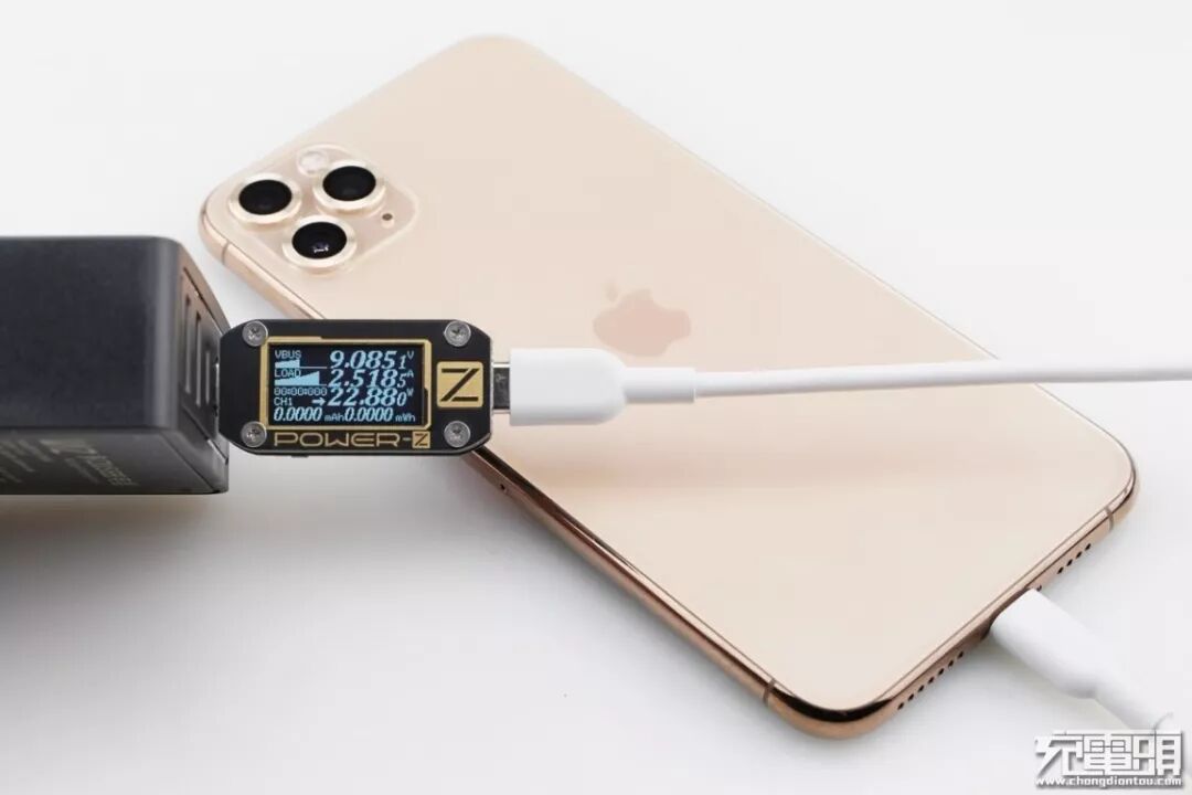 iPhone11 Pro Max 支持USB PD和Apple2.4A快速充电协议,使用USB-C2为iPhone11 Pro Max充电,功率为9.08V 2.51A 22.88W,成功握手USB PD快充,并达到USB PD快充功率最大阶段。