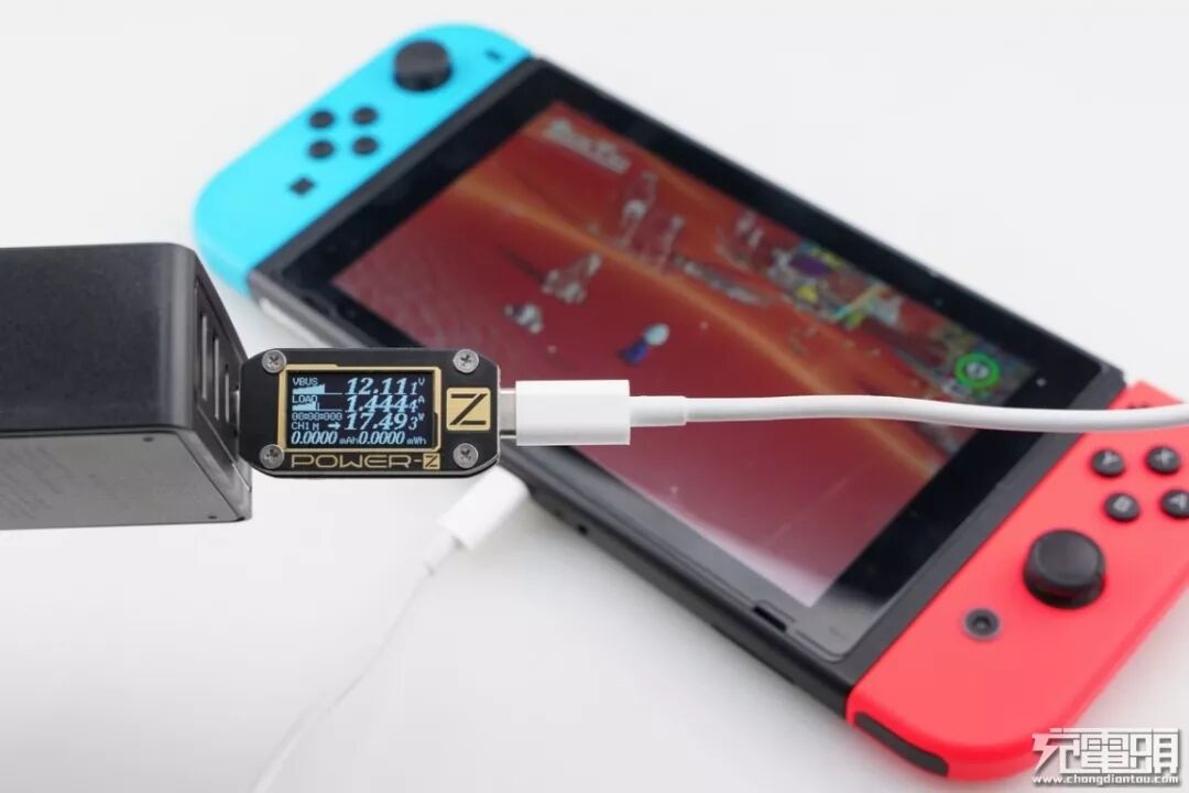 Switch支持USB PD快速充电,使用USB-C2为Switch充电,功率为12.11V 1.44A 17.49W,成功握手USB PD快充,并达到USB PD快充功率最大阶段。