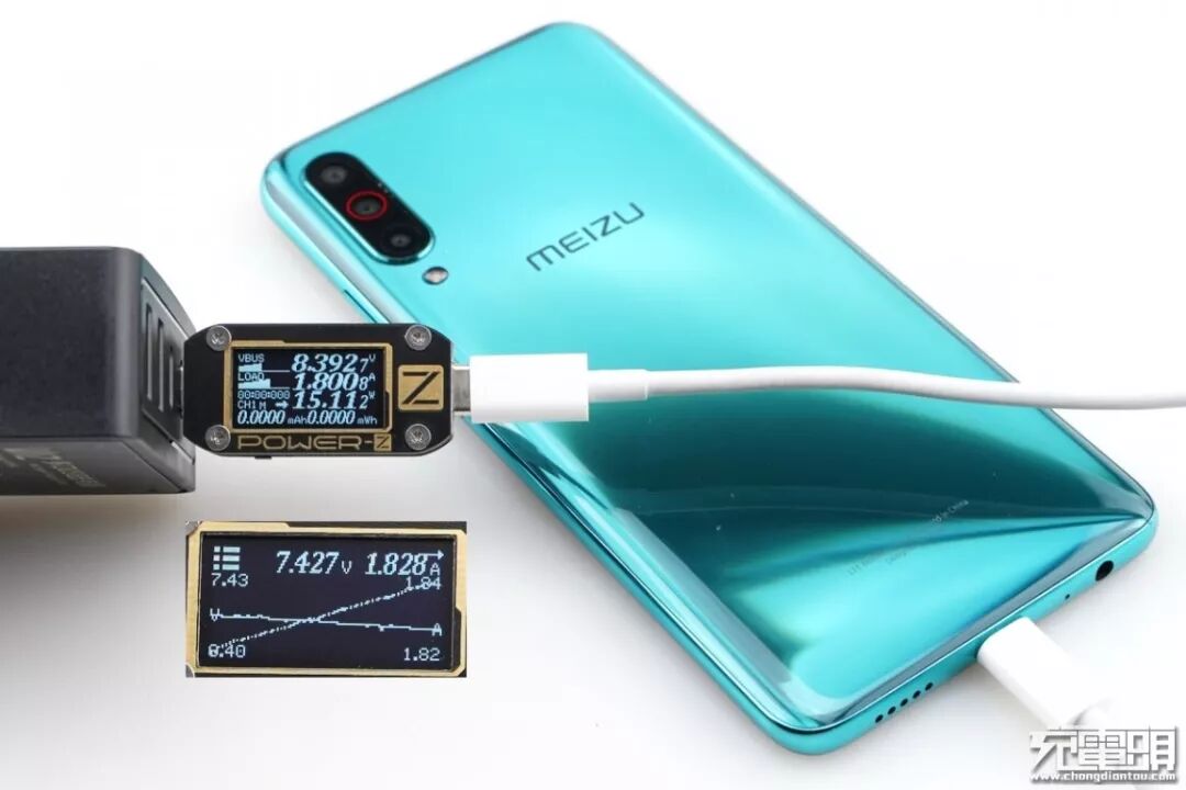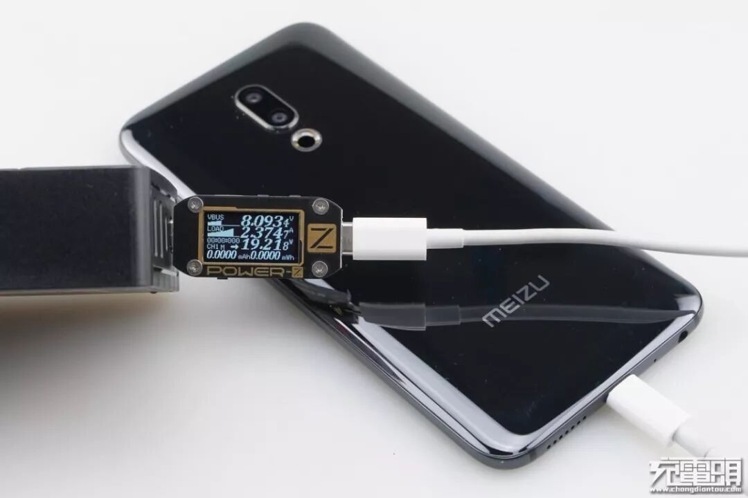 魅族16th Plus只支持PE快速充电协议,使用USB-C2为魅族16th Plus充电,功率为8.09V 2.37A 19.21W,成功握手PE快充,并达到PE快充功率最大阶段。