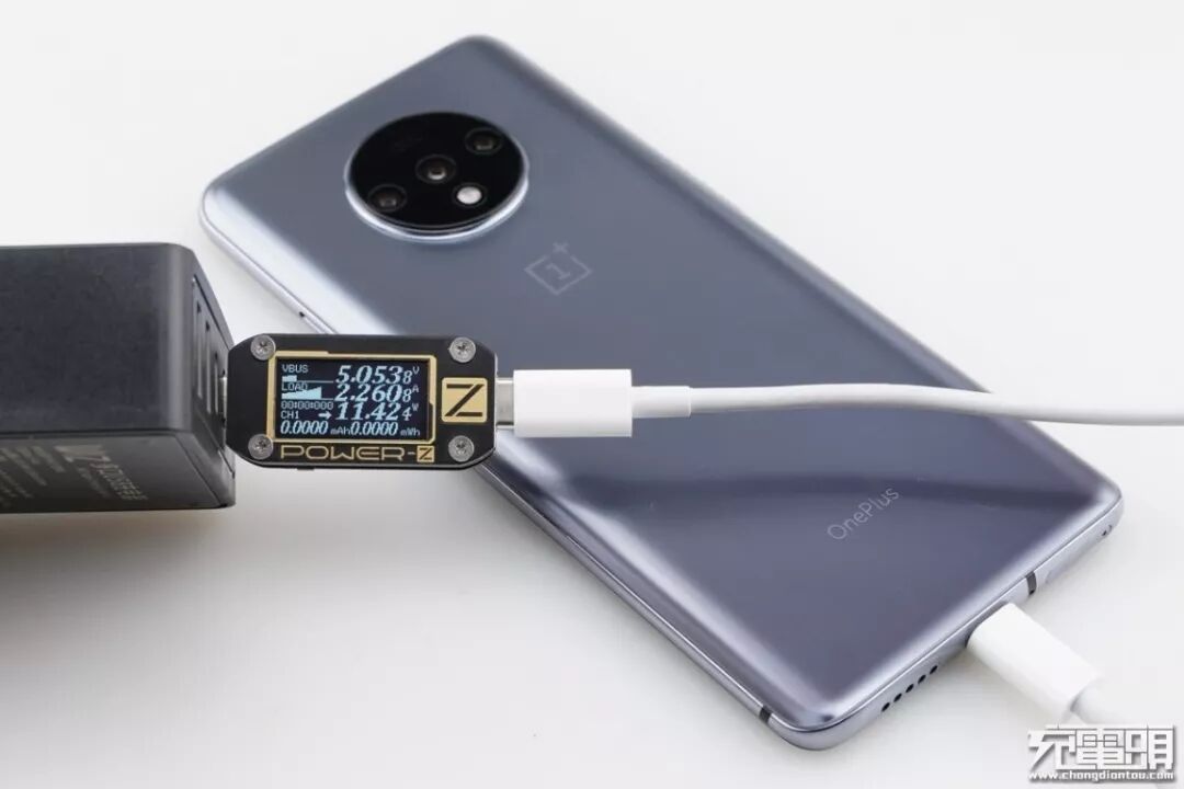 1+7T支持USB PD / WARP快速充电协议,使用USB-C2为1+7T充电,功率为5.05V 2.26A 11.42W,成功握手USB PD快充,并达到USB PD快充功率最大阶段。