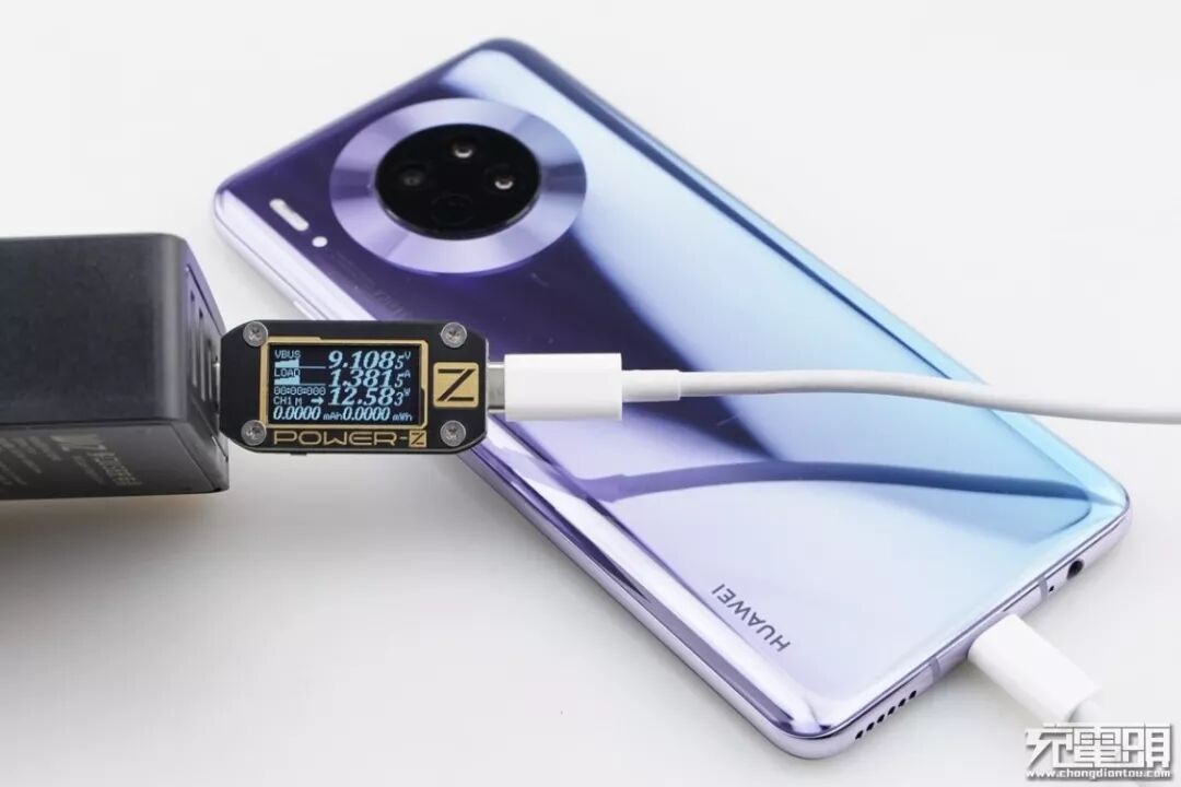 华为Mate30支持USB PD / FCP / SCP / 40WSCP 快速充电协议,使用USB-C1为华为Mate30充电,功率为9.13V 1.38A 12.66W,成功握手USB PD快充,并达到USB PD快充功率最大阶段。