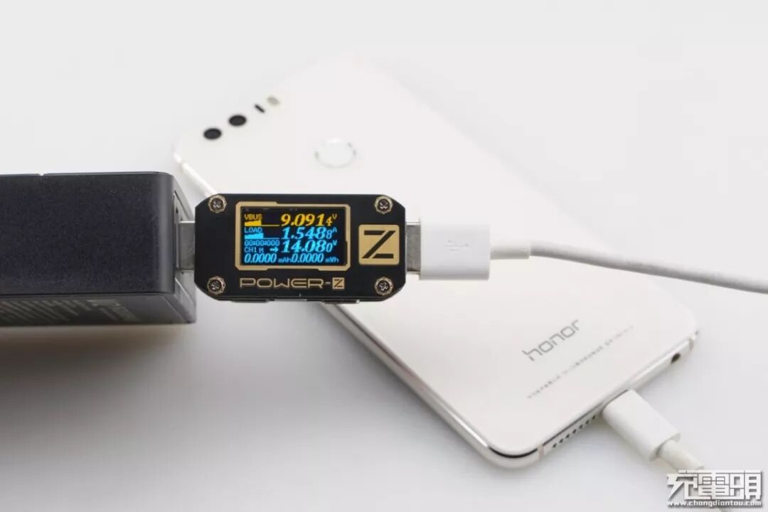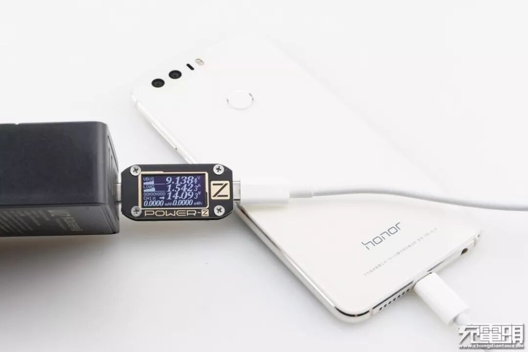 荣耀8只支持FCP快速充电协议,使用USB-A为荣耀8充电,功率为9.09V 1.54A 14.08W,成功握手FCP快充,并达到FCP快充功率最大阶段。