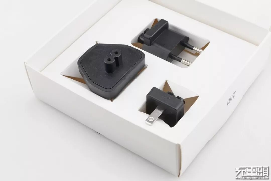 而在另外一个包装盒内,带有三个不同规格的插脚,方便用户在不同的区域使用,使用范围变的更加广泛,插脚侧边可以看到WIZ唯致Logo。