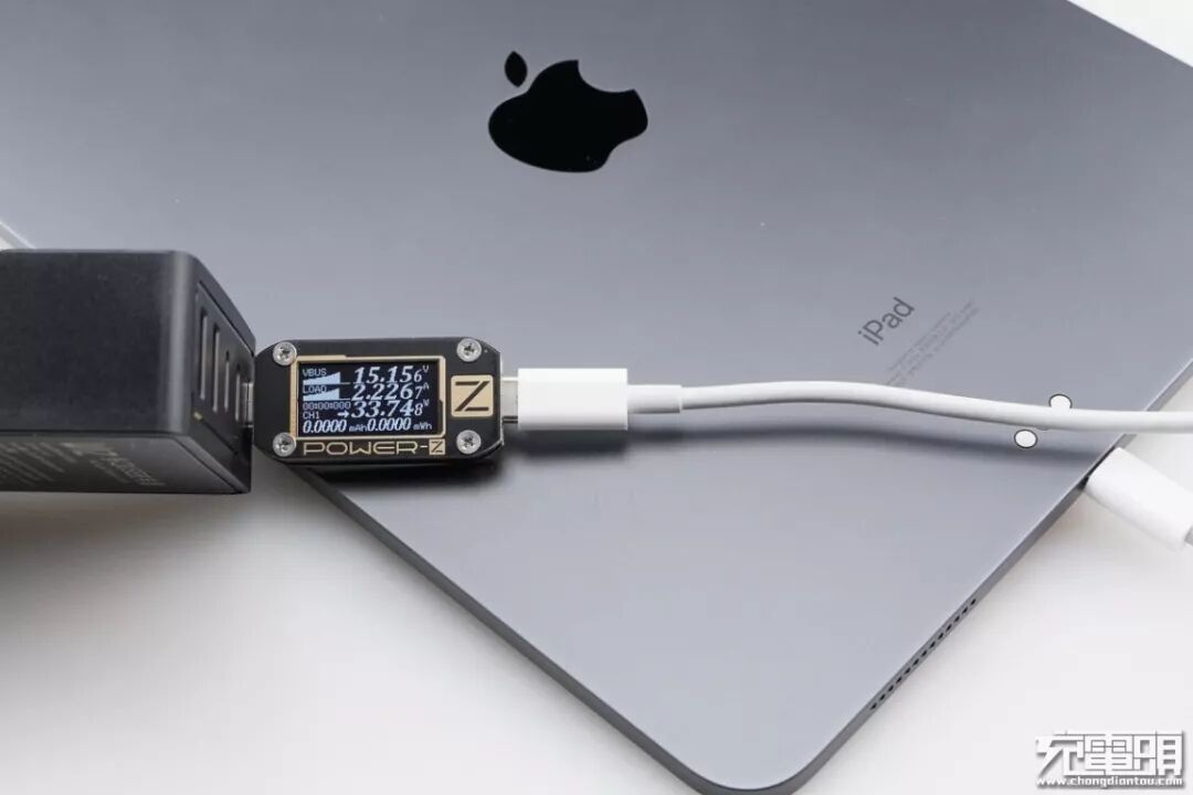 iPad Pro支持USB PD快速充电,使用USB-C1为iPad Pro充电,功率为15.15V 2.22A 33.74W,成功握手USB PD快充,并达到USB PD快充功率最大阶段。