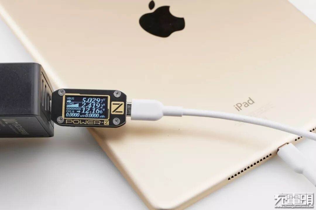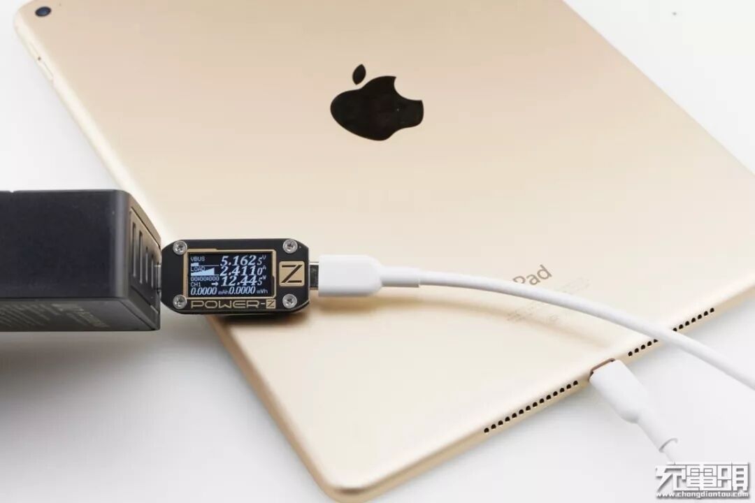 iPad Air2只支持Apple2.4A快速充电协议,使用USB-C2为iPad Air2充电,功率为5.02V 2.41A 12.16W,成功握手Apple2.4A快速充电协议,并达到Apple2.4A快充功率最大阶段。