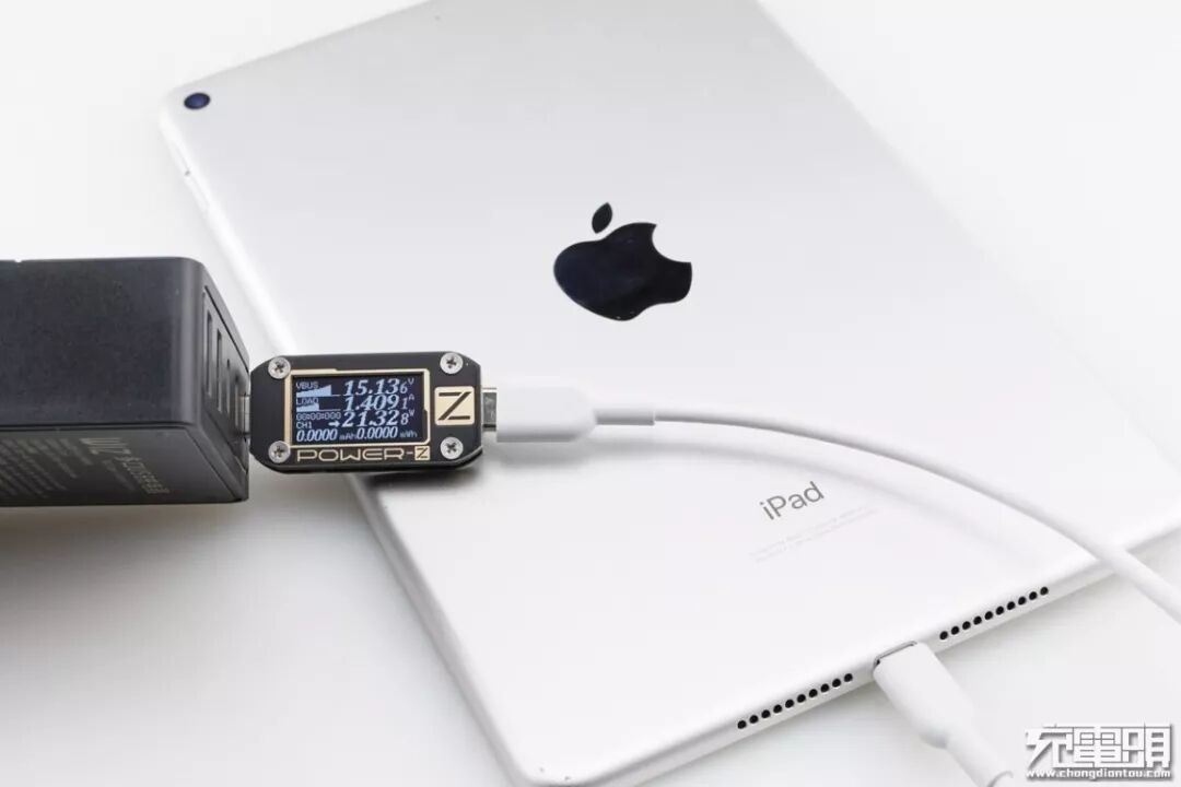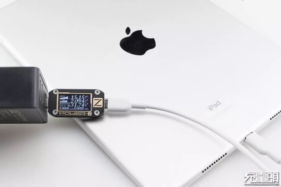 iPad Air3支持USB PD快速充电,使用USB-C1为iPad Air3充电,功率为15.15V 2.09A 31.74W,成功握手USB PD快充,并达到USB PD快充功率最大阶段。
