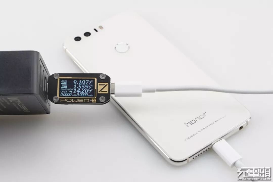 荣耀8只支持FCP快速充电协议,使用USB-C2为荣耀8充电,功率为9.10V 1.55A 14.20W,成功握手FCP快充,并达到FCP快充功率最大阶段。