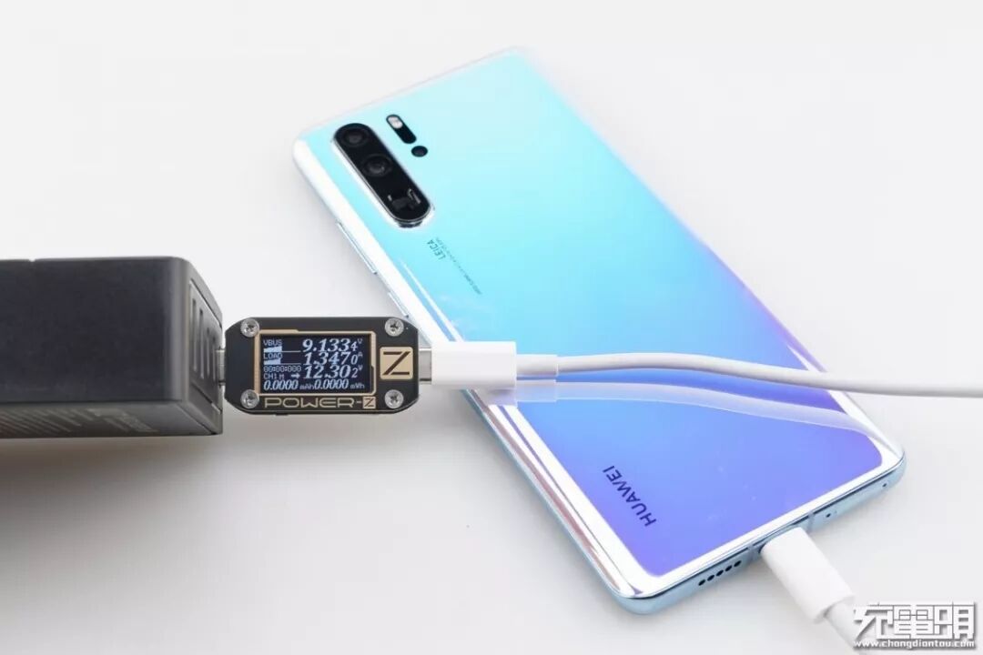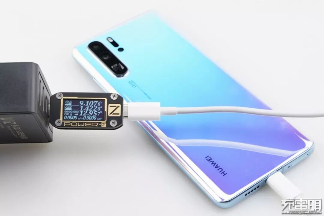 华为P30 Pro支持USB PD / FCP / SCP / 40WSCP快速充电协议,使用USB-C2为对P30 Pro充电,功率为9.10V 1.42A 12.95W,成功握手USB PD快充,并达到USB PD快充功率最大阶段。