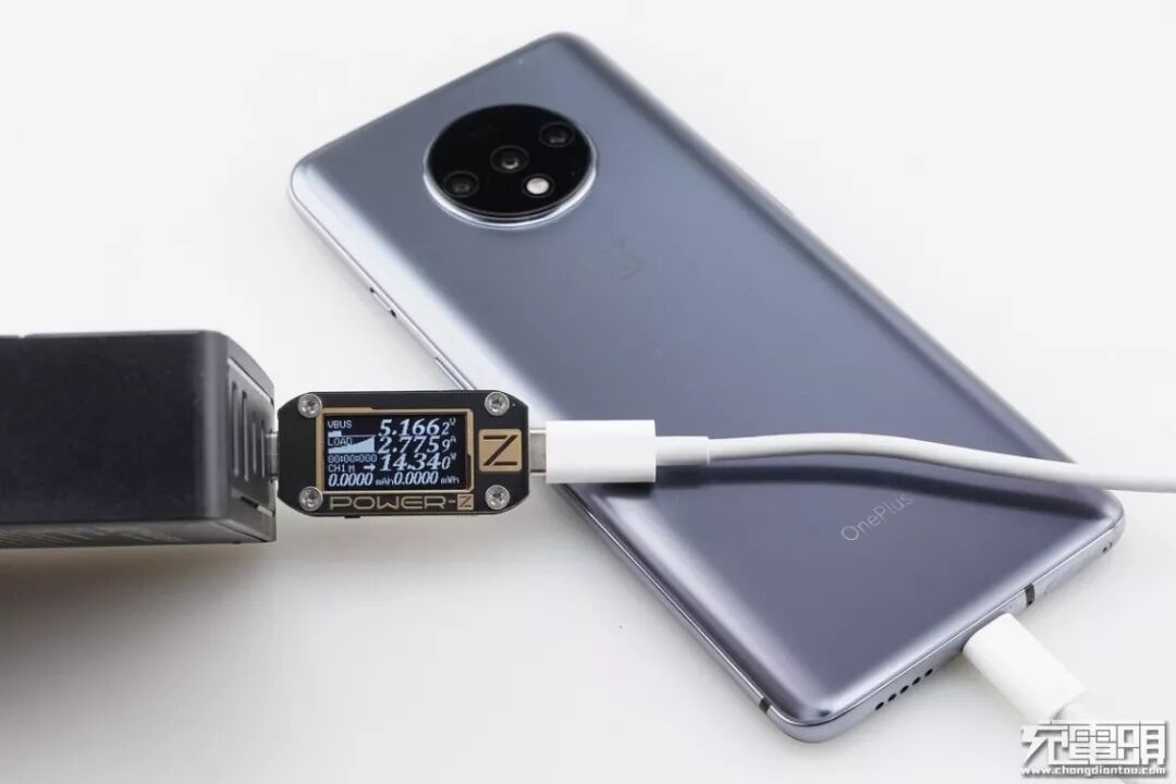 1+7T支持USB PD / WARP快速充电协议,使用USB-C1为1+7T充电,功率为5.16V 2.77A 14.34W,成功握手USB PD快充,并达到USB PD快充功率最大阶段。