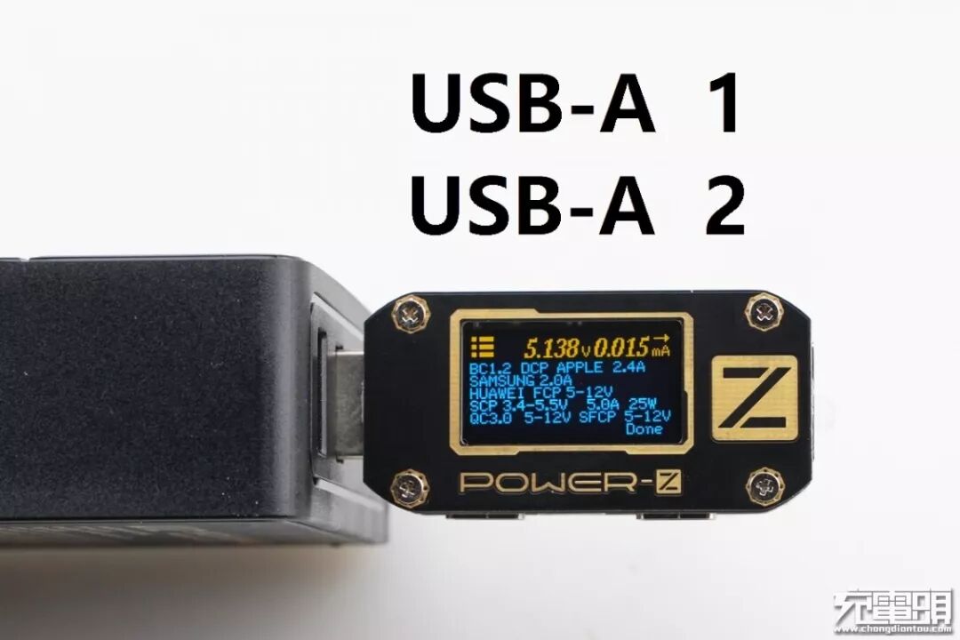 最后对产品的USB-A输出接口进行快充协议检测,USB-A1 / A 2支持的协议相同,支持Apple2.4A、QC、FCP、SCP等多种快充协议。