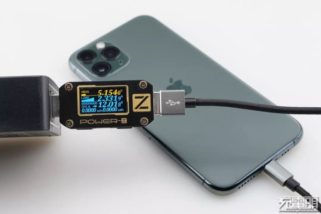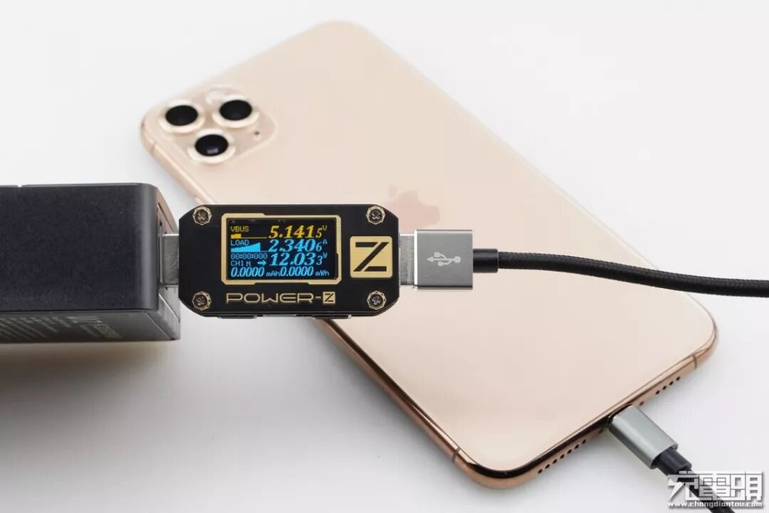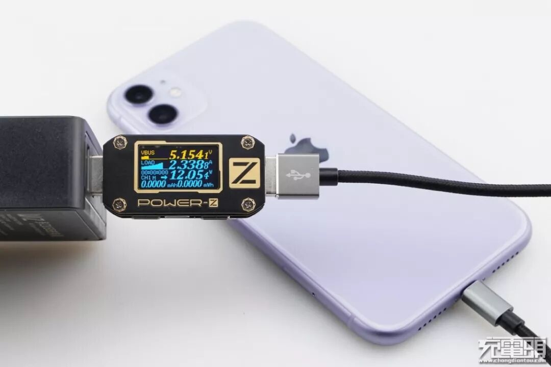 iPhone11 支持USB PD和Apple2.4A快速充电协议,使用USB-A为iPhone11 充电,功率为5.15V 2.33A 12.05W,成功握手Apple2.4A快充协议,并达到Apple2.4A快充功率最大阶段。