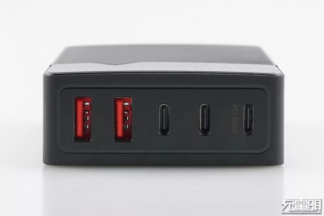 看一下产品的接口部分细节,左侧两个红色舌片的USB-A输出接口以及两个USB-C输出接口,右边是一个支持PD 60W输出的大功率USB-C输出接口。