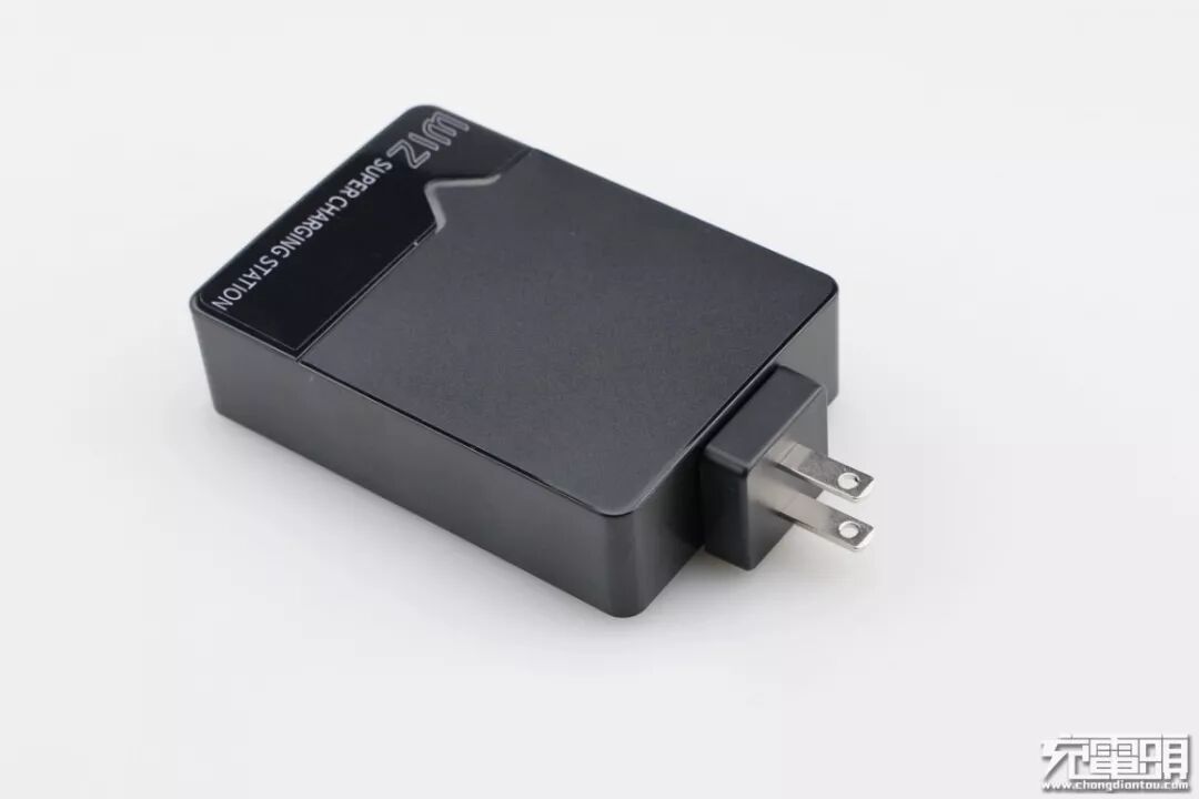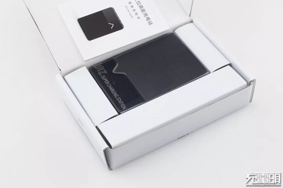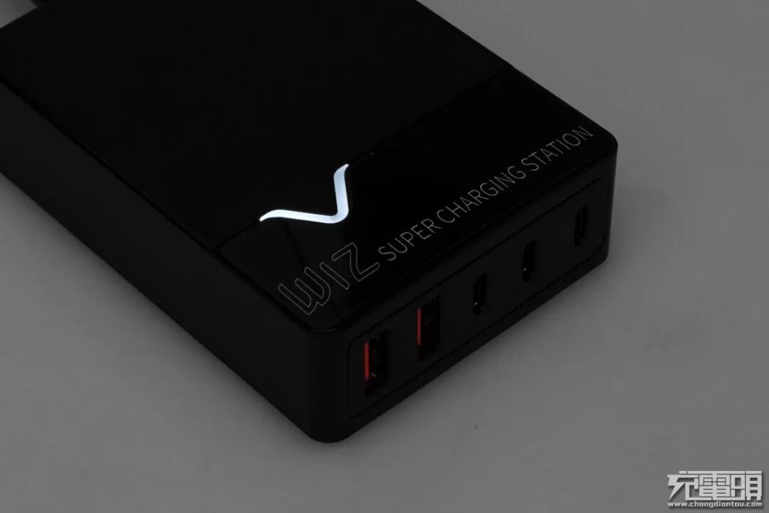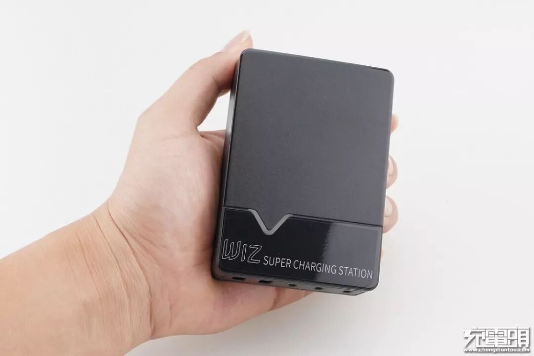 产品上手初体验,整体外观呈现磨砂黑和亮黑色,在亮黑色的部分带有产品的英文描述“WIZ SUPER CHARGING STATION”的字样,意为超级充电站,“V”字型分割线更像是产品“W”的一部分,更能映射出品牌的气息。