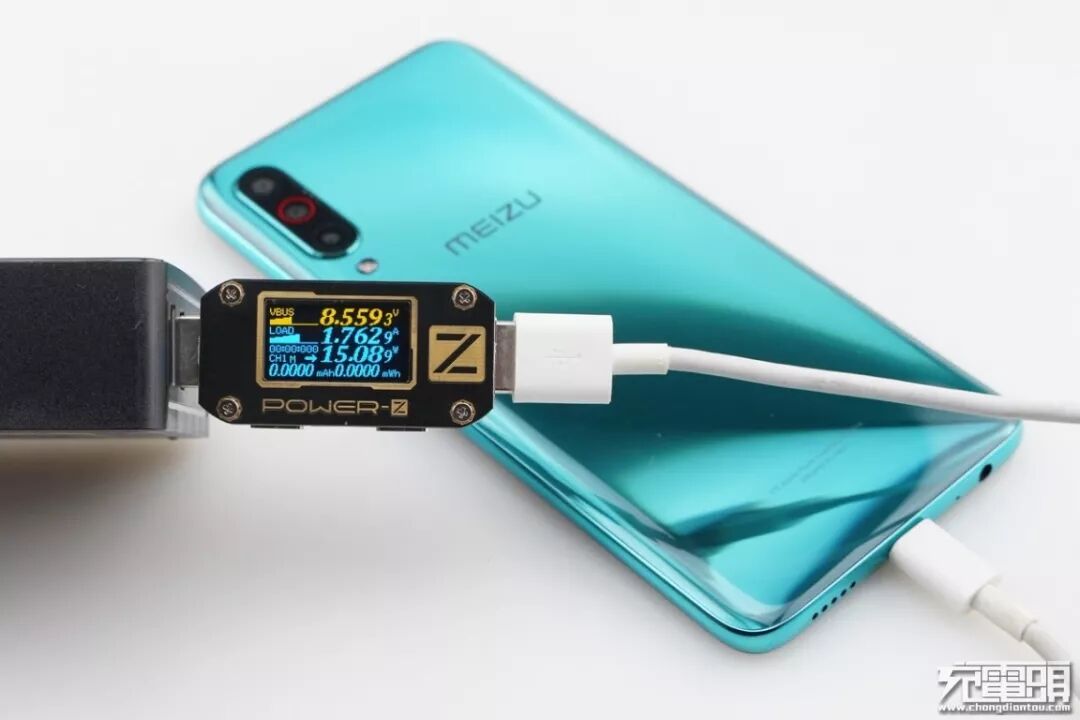 魅族16T支持USB PD / QC / PE快速充电协议,使用USB-A为魅族16T充电,功率为8.55V 1.76A 15.08W,成功握手QC快充,并达到QC快充功率最大阶段。