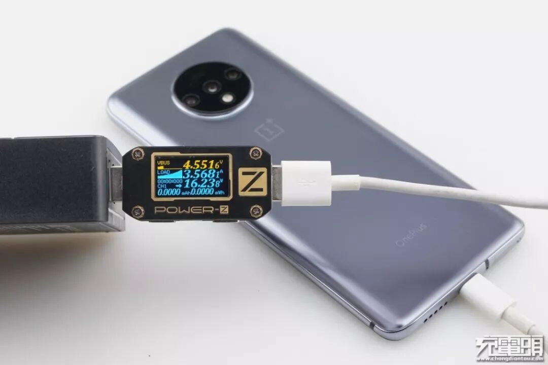 1+7T支持USB PD / WARP快速充电协议,使用USB-A为1+7T充电,功率为4.55V 3.56A 16.23W,成功握手Dash快充,并达到Dash快充功率最大阶段。