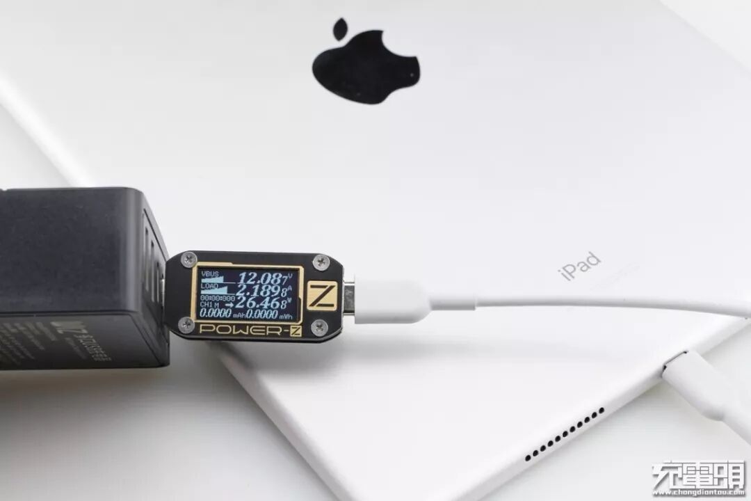 iPad Air3支持USB PD快速充电,使用USB-C2为iPad Air3充电,功率为12.08V 2.18A 26.46W,成功握手USB PD快充,并达到USB PD快充功率最大阶段。