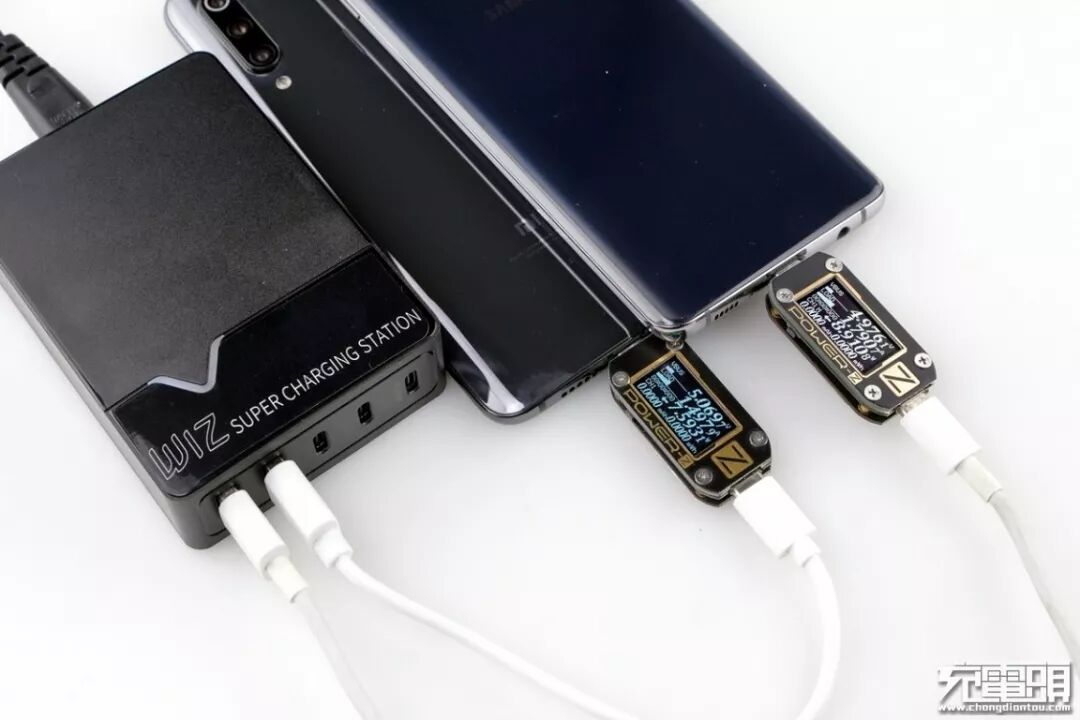 唯智五口充电器使用了三路独立设计,接下来我们来验证一下,使用产品的两个USB-A同时输出为手机充电,两个USB-A共用一路设计,单A口输出时候可提供快充,当两个USB-A都在输出时,会锁定5V模式。