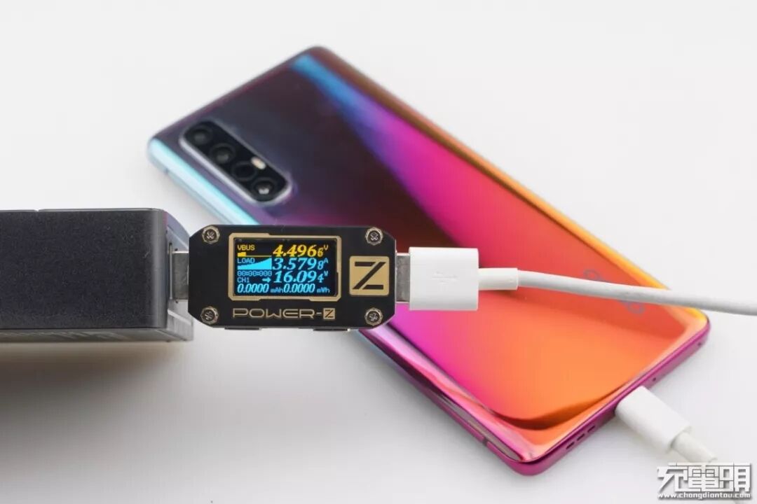 OPPO Reno 3 Pro 5G支持USB PD / VOOC4.0快速充电协议,使用USB-A为OPPO Reno 3 Pro 5G充电,功率为4.49V 3.57A 16.09W,成功握手VOOC3.0快充,并达到VOOC3.0快充功率最大阶段。