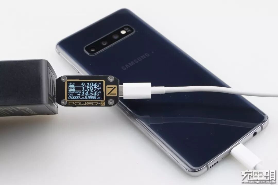 S10+支持USB PD / AFC / QC快速充电协议,使用USB-C2为S10+充电,功率为9.10V 1.59A 14.54W,成功握手USB PD快充,并达到USB PD快充功率最大阶段。