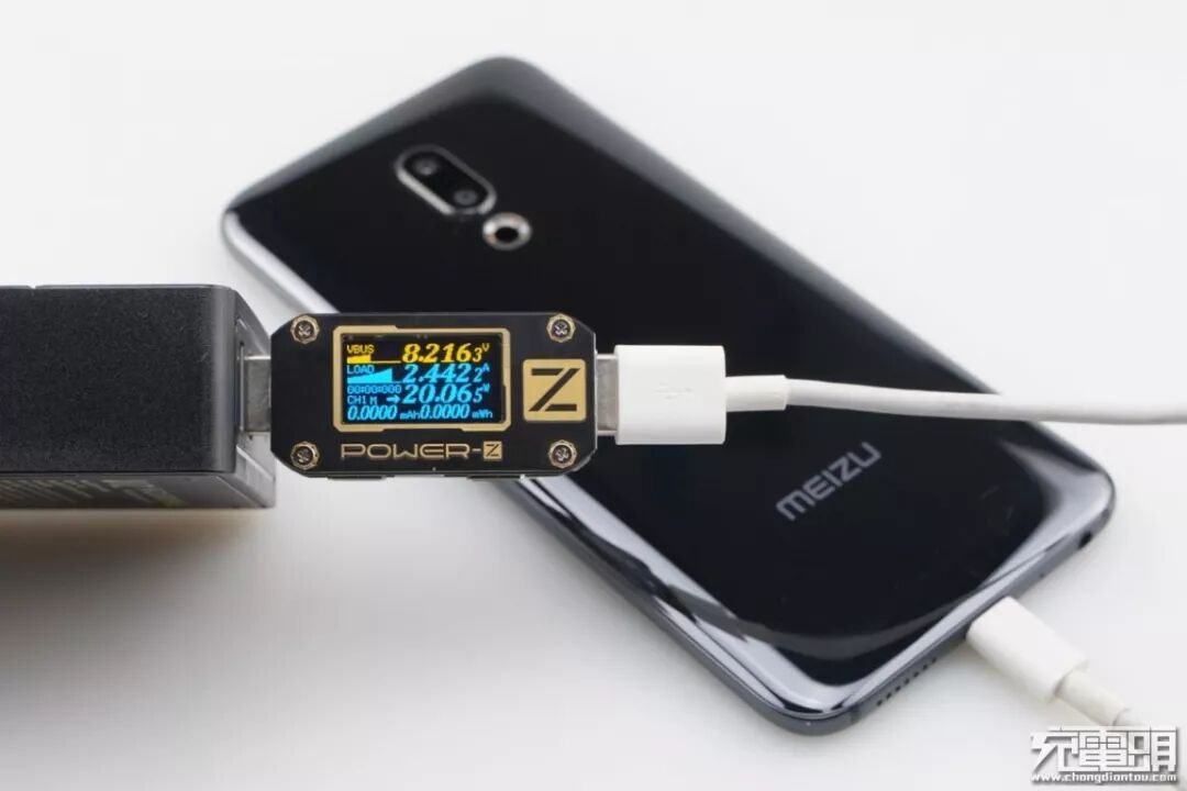 魅族16th Plus只支持PE快速充电协议,使用USB-A为魅族16th Plus充电,功率为8.21V 2.44A 20.06W,成功握手PE快充协议,并达到PE快充功率最大阶段。