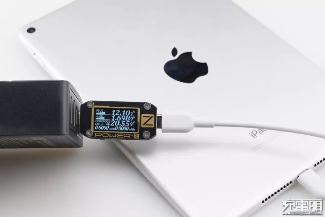 iPad mini5支持USB PD快速充电,使用USB-C2为iPad mini5充电,功率为12.10V 1.69A 20.55W,成功握手USB PD快充,并达到USB PD快充功率最大阶段。