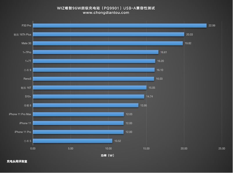 将数据做成柱状图,可以看到华为P30 Pro充电功率领跑在第一,达到了22.99W;支持QC、FCP、SCP、PE、VOOC等快充的数据也可以成功握手快充,iPhone11系列同样可以正常握手Apple2.4A快充协议,并且功率均均达到了12W。