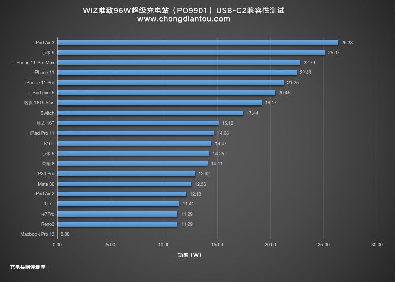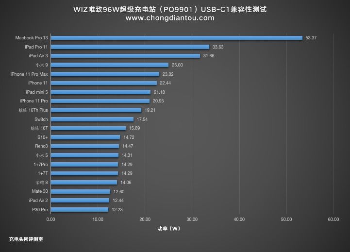 我们还将数据以柱状图的形式表现出来,这样可以更直观的了解到每个设备的充电功率大小,Macbook Pro 13和ipad等支持PD快充协议的大功率用电设备自然领跑在前面;其他支持PD快充协议的手机设备紧随其后,并且都可以得到不错的充电功率;仅支持QC、FCP、PE等单快充协议的设备均可以正常的握手快充,这个成绩还是非常不错的。