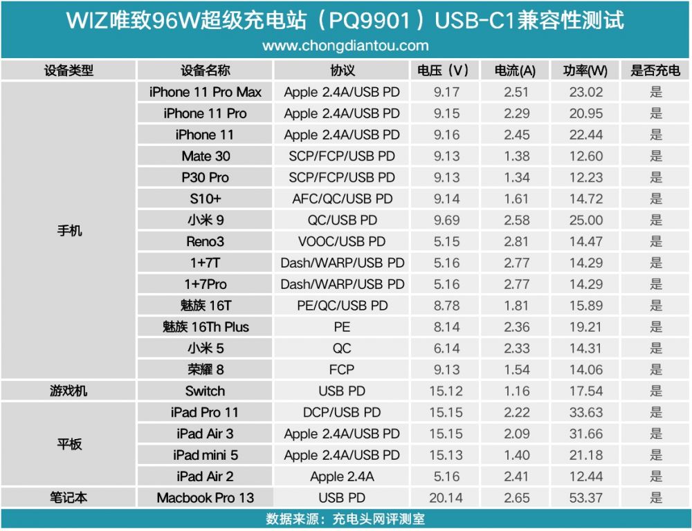 将USB-A输出的测试数据整理一下,对iPhone 11系列可以正常握手Apple2.4A快充协议;华为等支持SCP的手机也可以正常握手快充;对支持QC、FCP、PE等快充的手机同样可以正常的握手快充,特别是连VOOC也支持,这个有点意外。