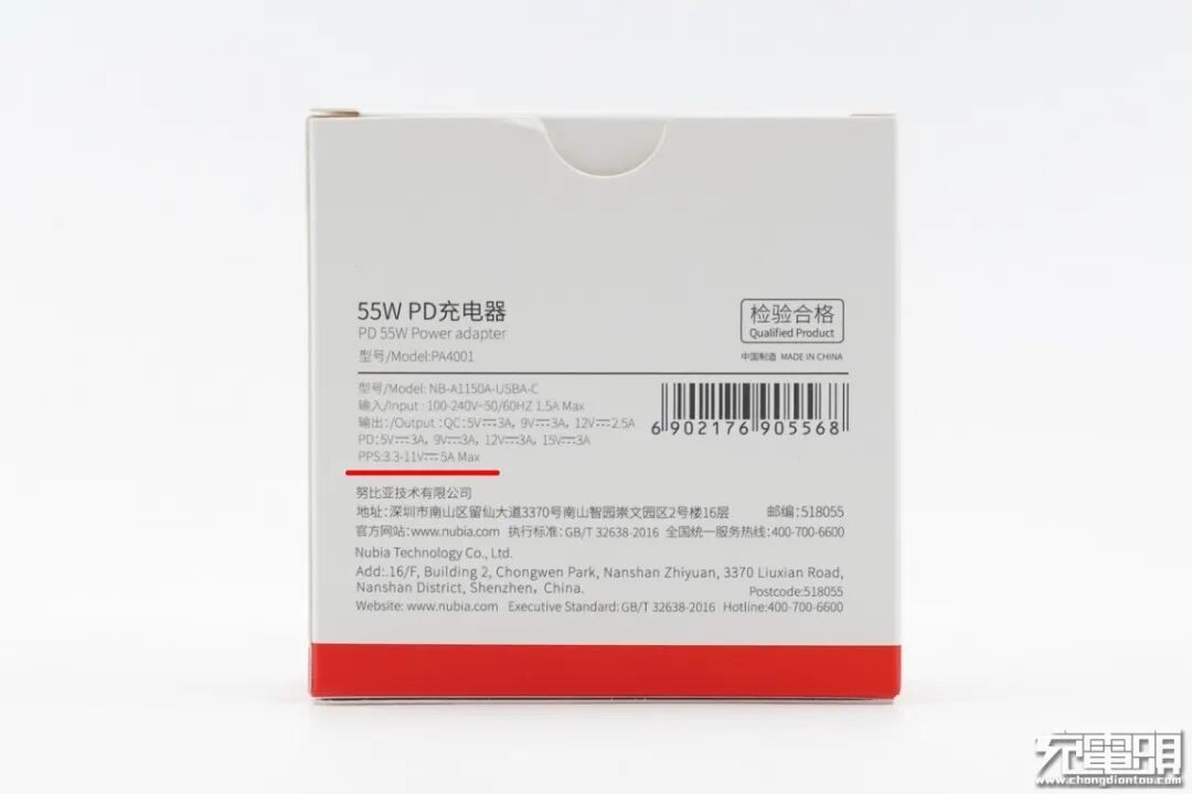 努比亚55W PD充电器采用白色纸盒包装,正中间印有充电器外观图,底部红色横条作点缀,与nubia LOGO做主打色调一致。