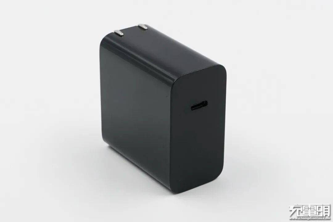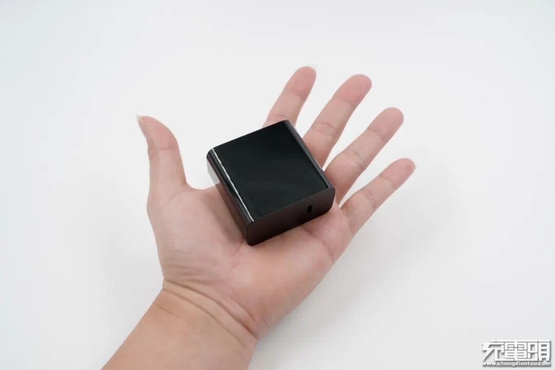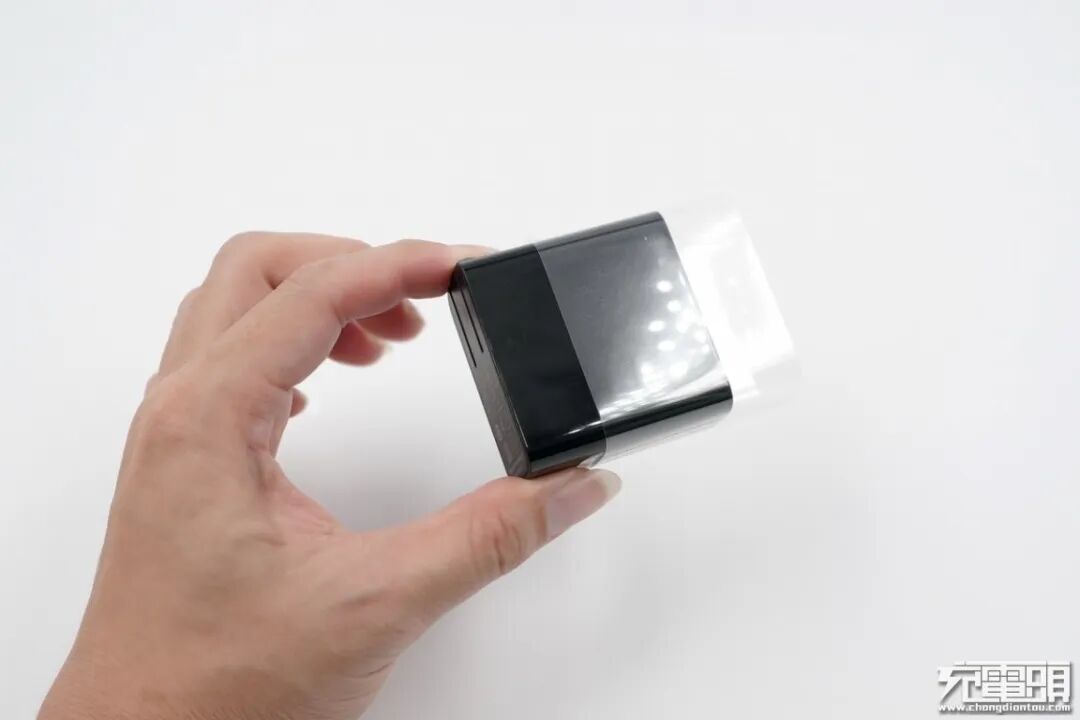 努比亚55W PD充电器外观全黑,不带任何LOGO丝印,体积与市面上常见的65W PD充电器接近。充电器表面工艺四侧亮面反光,接口面板磨砂处理,边缘圆弧过渡。