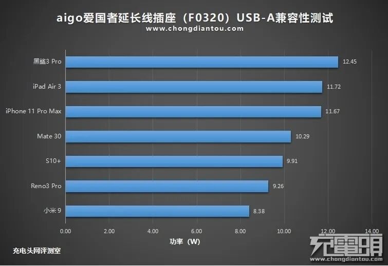 把功率数据制作成柱状图,iPhone 11 Pro Max、Mate30、黑鲨3Pro、iPad Air3充电功率都超过了10W,其他功率在8-9W之间。