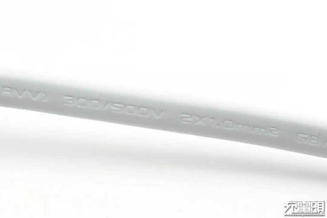 线缆表皮上凹印了技术参数,额定长时间使用耐压300V,峰值短时间耐压500V,线芯横截面积为2 x 1.0mm²。新国标线缆相比起以前的老旧标准,对线缆横截面参数要求更加严苛,从以前的0.75mm² 加粗到1.0mm²,过流能力更强,大功率使用时温升更低。