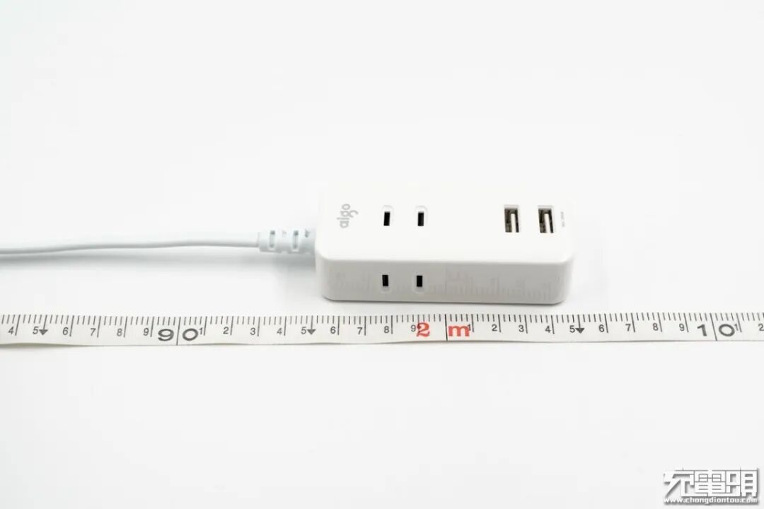 aigo爱国者延长线插座带有三个220V交流电两脚插孔,两个USB-A输出口,体积却只有97.4 x 43.1 x 25.2mm,与常见的插线板相比,还不到一半的体积。