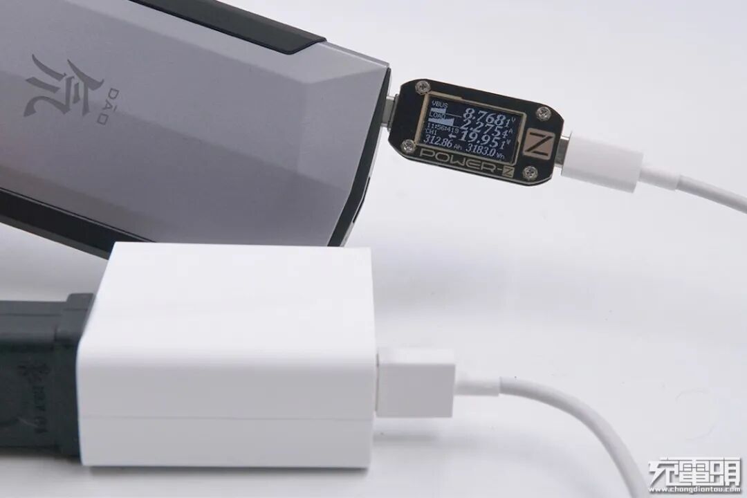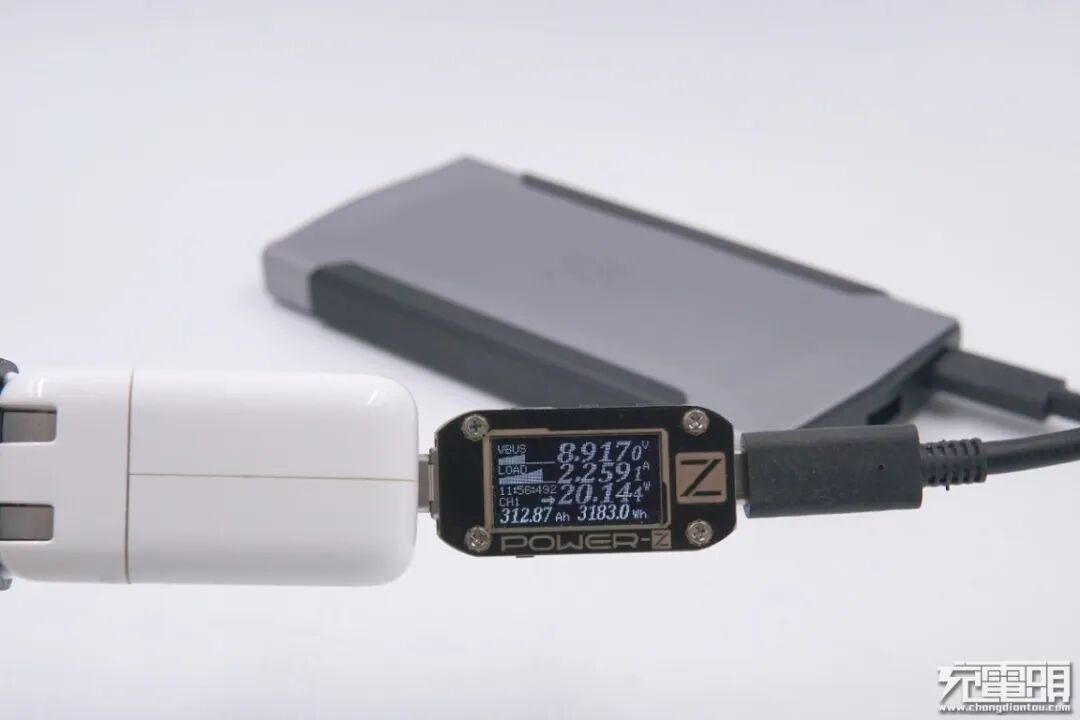 使用魔改USB-A的PD充电器为移动电源充电,功率为8.76V 2.27A 19.95W,同样可以成功握手9V电压档位,开启PD快充输入。