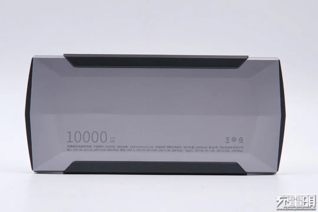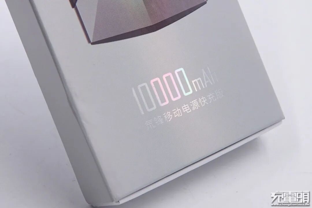 整个外包装采用的是亮面设计,上面的文字说明部分还带有彩色字体加持,使得整体感觉就不一样。在下方带有产品的一些信息,这款移动电源的电池容量为10000mAh,并且是氘锋移动电源快充版。