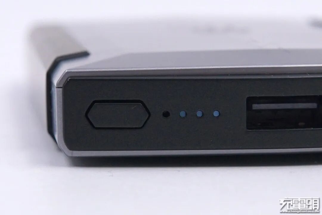 看一下移动电源的接口面板,从左至右依次为电源按键、四颗电量指示灯、USB-A输出接口以及USB-C双向快充接口。