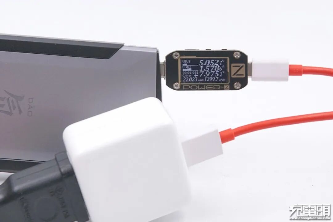 最后使用Dash闪充充电器为移动电源充电,功率为5.05V 1.57A 7.97W,普通5V 2A充电模式。