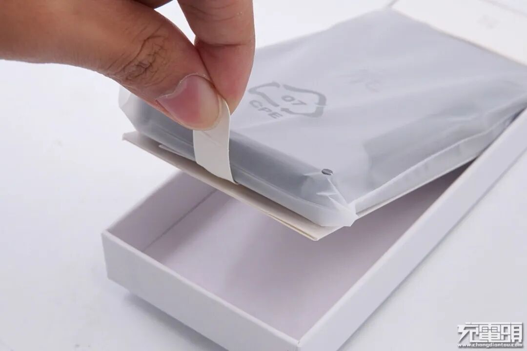 拿出里面的移动电源,使用透明的保护袋包裹着,这样可以防止移动电源外壳被刮伤,全方位的保护产品。
