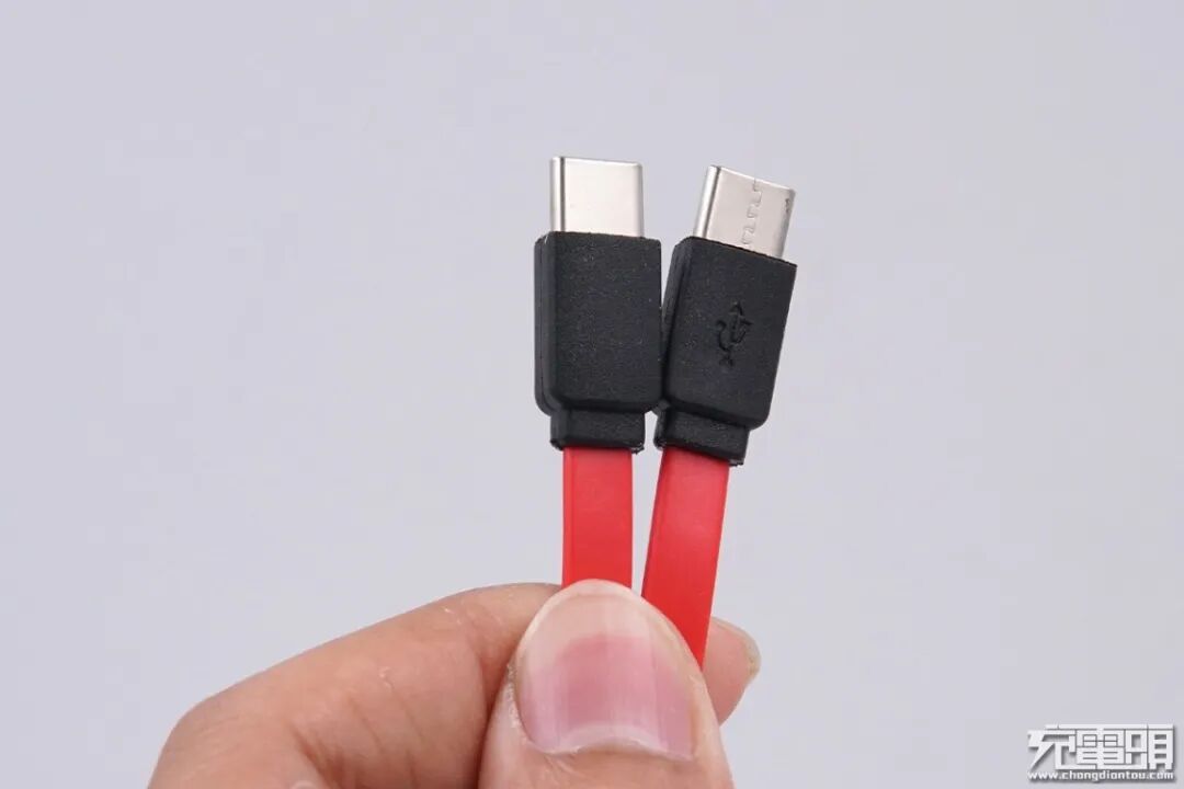在内部自带了一条红色外观的面条数据线,数据线为双USB-C设计,端子头为黑色,在上面带有传输的图形标识。