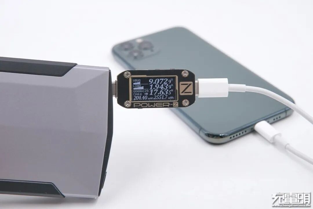 接下来对移动电源的USB-C接口进行输出兼容性测试,为iPhone 11 Pro充电,功率为9.07V 1.94A 17.63W,成功握手PD快充协议。