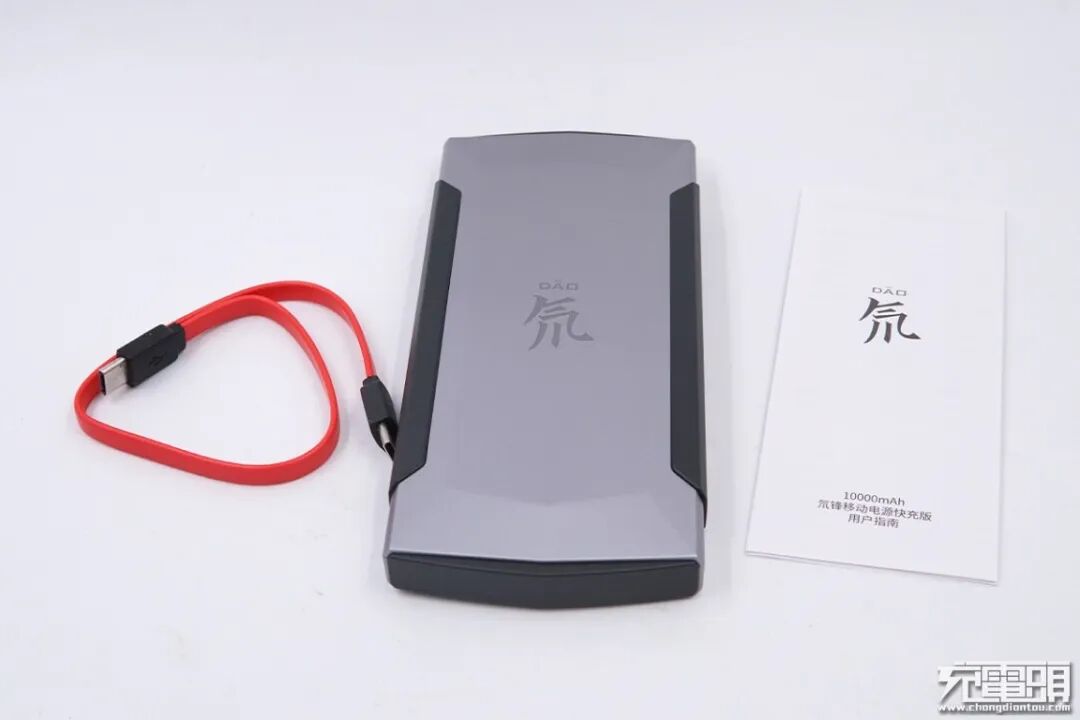 看一下包装内的物品吧,移动电源本体、双USB-C接头的红色面条装数据线以及产品使用说明书一份。