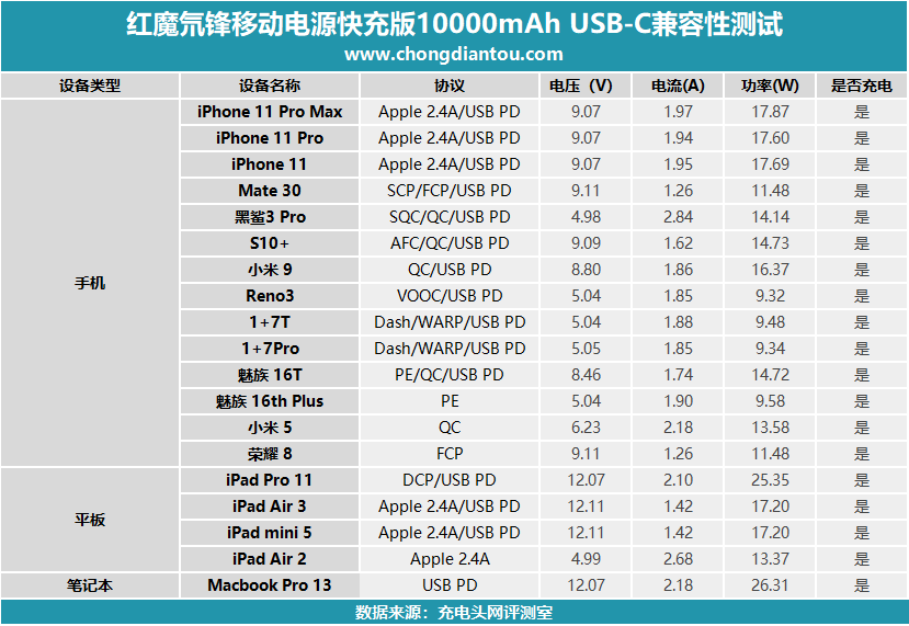 随后小编找来了数款手机和三款平板对移动电源的USB-A输出进行了测试,并将数据汇总到表格当中。从数据上来看,小米9等支持QC快充协议的安卓设备充电功率排在前面,仅支持PE快充协议的魅族16th Plus功率为7.75V 1.82A 14.11W,努比亚红魔的这款氘锋移动电源快充版还支持PE快充,支持Apple2.4A快充协议的苹果设备则排在后面,功率均超过了10W,大多数都达到了快充功率最大阶段。