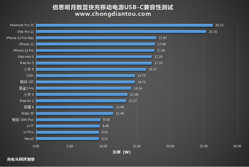 将数据以柱状图的形式表现出来,可以很直观的看到MacBook Pro和iPad Pro的充电数据排在前面,支持PD快充协议的iPhone和iPad紧随其后,功率在17W左右,后面的是支持PD快充协议的安卓设备,功率在11W-15W之间。