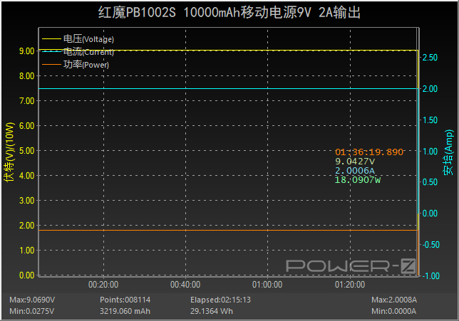 接下来以9V 2A的档位对移动电源进行输出效率测试,测试全程电压、电流以及功率三大平台均持稳定输出状态,全程耗时约1小时36分。放出的能量约为29.14Wh,所以移动电源在以9V 2A输出时效率约为29.14 / 37=78.76% 。