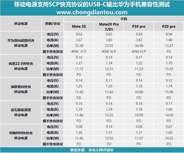 将测试的数据放在表格当中,从表格当中可以得到的信息是,除P20 Pro之外的三款手机在使用华为自家的双向超级闪充移动电源充电时均可以成功握手40W SCP快充协议,使用剩余四款移动电源为Mate30、Mate20 Pro(UD)和P30 Pro充电时可以成功握手PD快充协议。P20 Pro在使用以上五款移动电源时均可以成功握手PD快充协议。